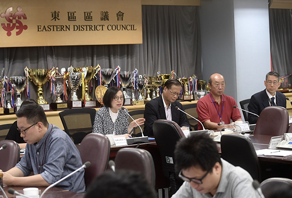 The Secretary for Food and Health, Professor Sophia Chan (fourth right), today (September 5) met with Eastern District Council members to exchange views on medical and environmental hygiene issues in the district. Also present are the Chairman of the Eastern District Council, Mr Wong Kin-pan (third right), and the District Officer (Eastern), Mr Simon Chan (first right).