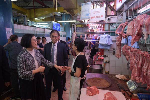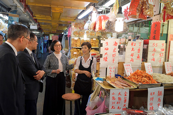 The Secretary for Food and Health, Professor Sophia Chan (first left), chats with a stall operator to understand her business environment as she visits the Sai Wan Ho Market and Cooked Food Centre today (September 5).
