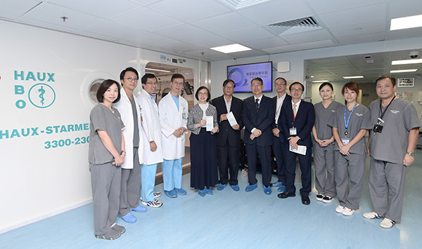 The Secretary for Food and Health, Professor Sophia Chan (fifth left), is pictured with the healthcare staff at the Accident and Emergency Department's hyperbaric oxygen therapy centre in the Pamela Youde Nethersole Eastern Hospital today (September 5).
