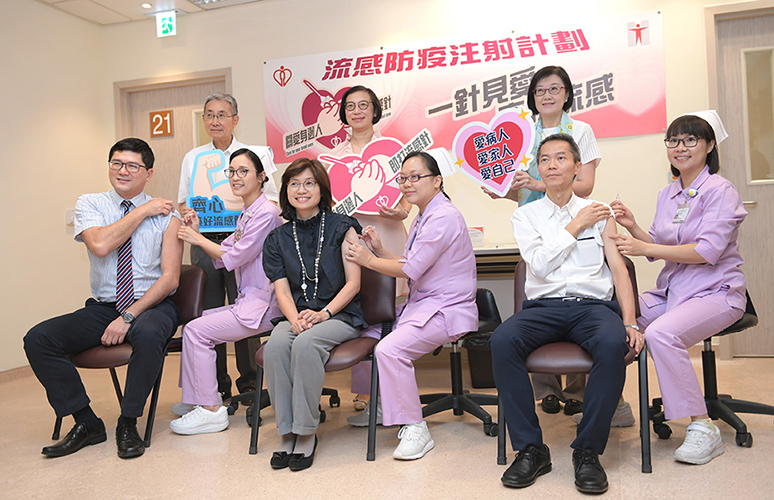 The Secretary for Food and Health, Professor Sophia Chan (back row, third right); the Permanent Secretary for Food and Health (Health), Ms Elizabeth Tse (back row, first left); the Director of Health, Dr Constance Chan (back row, second right); the Controller of the Centre for Health Protection of the Department of Health, Dr Wong Ka-hing (back row, first right); the Chairman of the Hospital Authority (HA), Professor John Leong (back row, third left); and the Chief Executive of the HA, Dr Tony Ko (back row, second left), look on as a doctor, a nurse and a speech therapist receive their seasonal influenza vaccinations today (October 24).