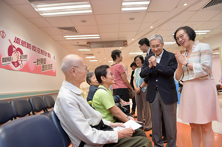 The Secretary for Food and Health, Professor Sophia Chan (first right), chats with elderly people waiting to receive their vaccinations during her visit to the Kwun Tong Community Health Centre today (October 24). Looking on is the Chairman of the Hospital Authority, Professor John Leong (second right).