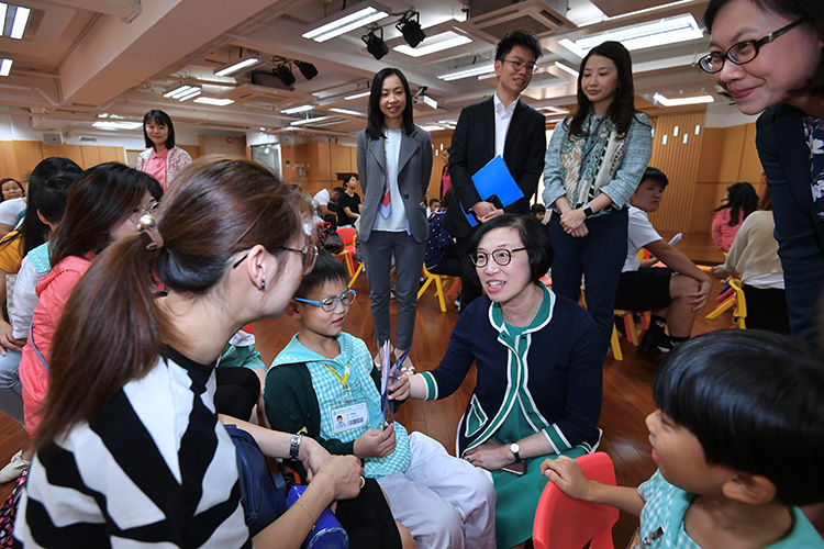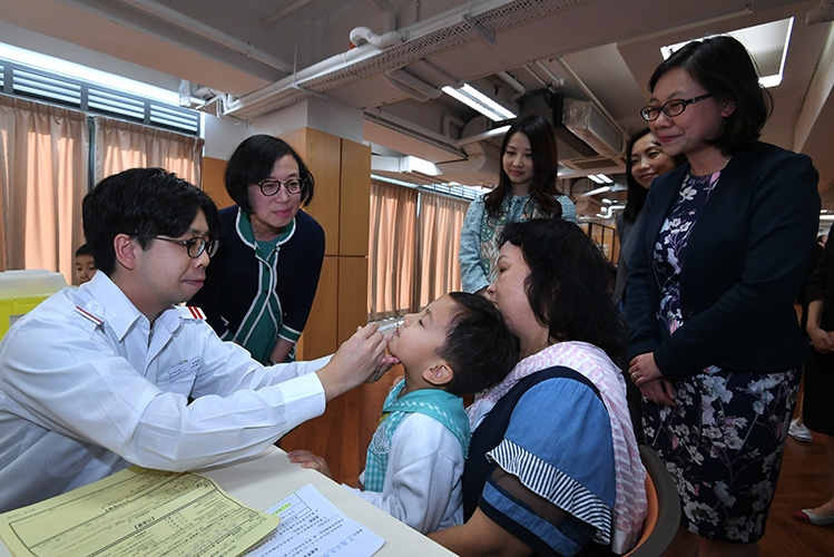 The Secretary for Food and Health, Professor Sophia Chan (second left), this afternoon (November 7) visited Fanling Baptist Church Lui Ming Choi Kindergarten in Fanling to observe the responses of schoolchildren receiving live attenuated influenza vaccine (i.e. nasal vaccine).