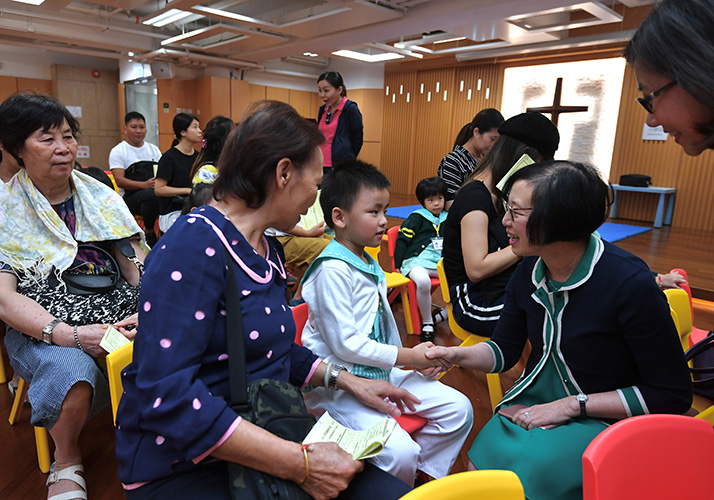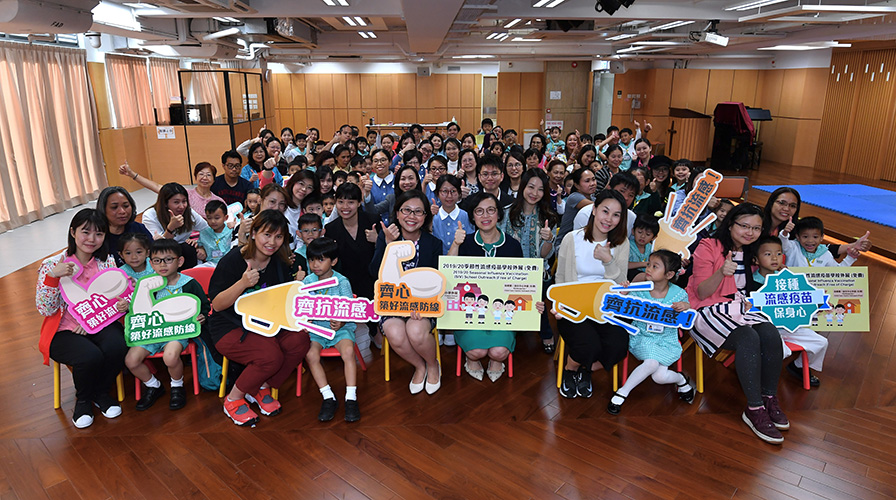 The Secretary for Food and Health, Professor Sophia Chan (front row, fifth right), and the Principal of Fanling Baptist Church Lui Ming Choi Kindergarten, Ms Lo Pui-yin (front row, fifth left), are pictured with pupils of the school and their parents as well as members of the Government Outreach Team providing nasal vaccination service for the schoolchildren after observing the outreach vaccination arrangements under the 2019/20 Seasonal Influenza Vaccination School Outreach (Free of Charge) - Kindergartens/Kindergarten-cum-Child Care Centres/Child Care Centres (Pilot) this afternoon (November 7).