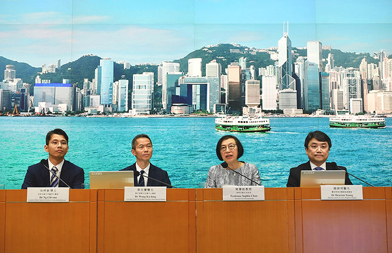 The Secretary for Food and Health, Professor Sophia Chan (second right); the Controller of the Centre for Health Protection of the Department of Health, Dr Wong Ka-hing (second left); the Director (Cluster Services) of the Hospital Authority, Dr Deacons Yeung (first right); and the Consultant Chinese Medicine Practitioner, Food and Health Bureau, Dr Ng Chi-sun (first left), hold a press conference today (December 18) on seasonal influenza and the corresponding measures to cope with the situation.
