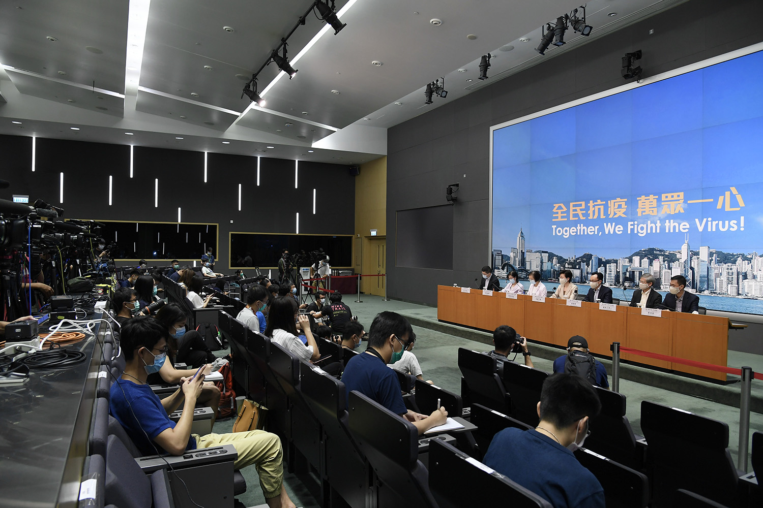 The Chief Executive, Mrs Carrie Lam (centre), holds a press conference on measures to fight the epidemic with the Chief Executive of the Hospital Authority, Dr Tony Ko (first right); the Director of Health, Dr Constance Chan (second left); the Secretary for Food and Health, Professor Sophia Chan (third left); the Secretary for Civil Service, Mr Patrick Nip (third right); the Secretary for Labour and Welfare, Dr Law Chi-kwong (second right); and the Secretary for Education, Mr Kelvin Yeung (first right), at the Central Government Offices, Tamar, today (July 19).