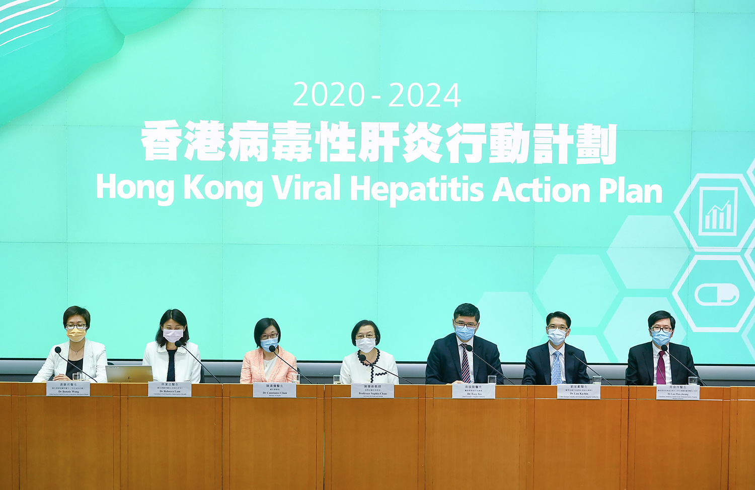 The Secretary for Food and Health, Professor Sophia Chan (centre); the Director of Health, Dr Constance Chan (third left); the Chief Executive of the Hospital Authority (HA), Dr Tony Ko (third right); the Consultant (Viral Hepatitis) of the Department of Health (DH) and Convenor of the Public Health Working Group, Dr Rebecca Lam (second left); the Chief Manager (Quality and Standards) of the HA and Convenor of the Clinical Working Group, Dr Lau Ka-hin (second right); the Consultant (Medicine) of Pamela Youde Nethersole Eastern Hospital of the HA, Dr Lao Wai-cheung (first right); and the Acting Consultant (Special Preventive Programme) of the DH, Dr Bonnie Wong (first left), unveil the Hong Kong Viral Hepatitis Action Plan 2020-2024 today (October 8).