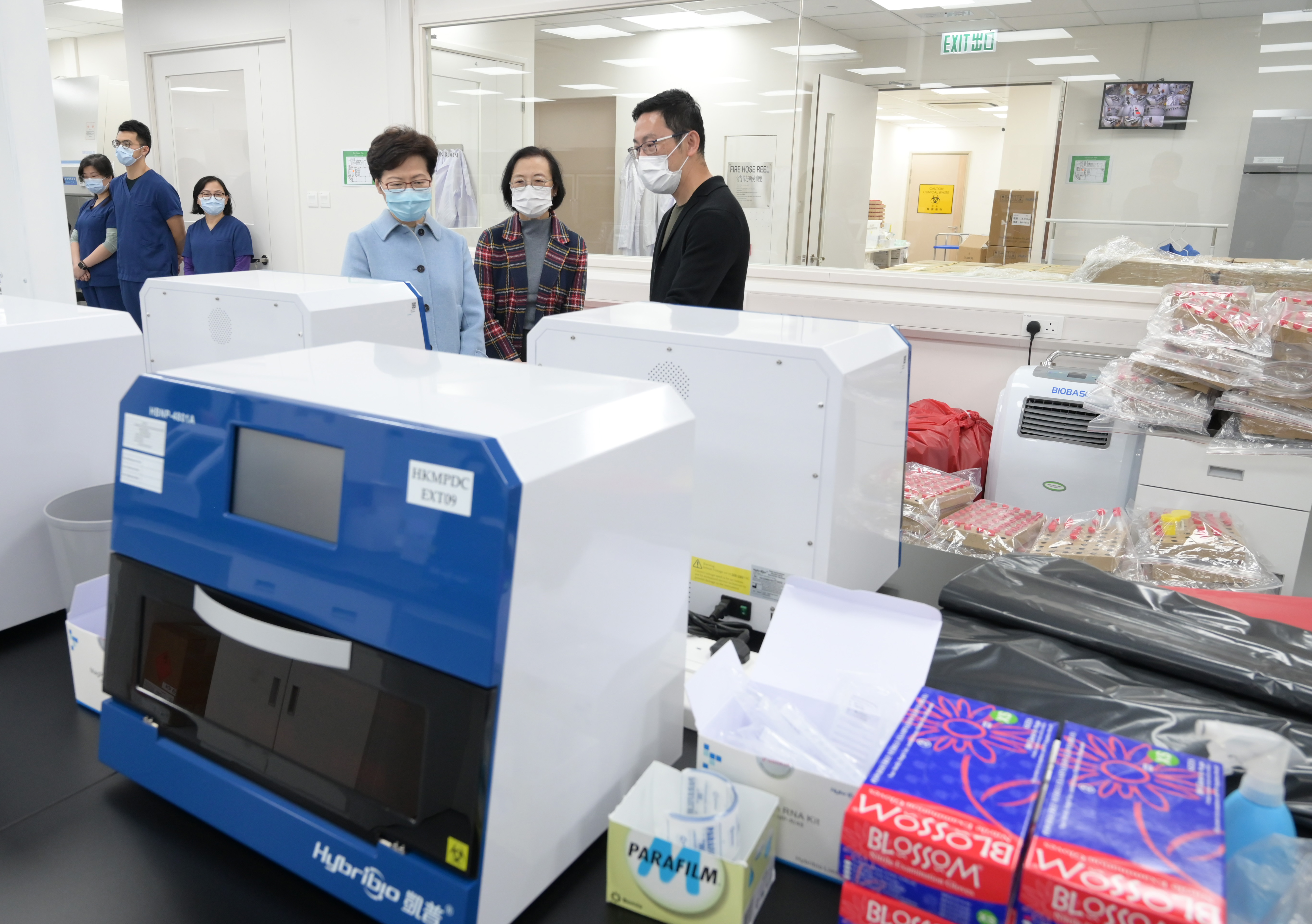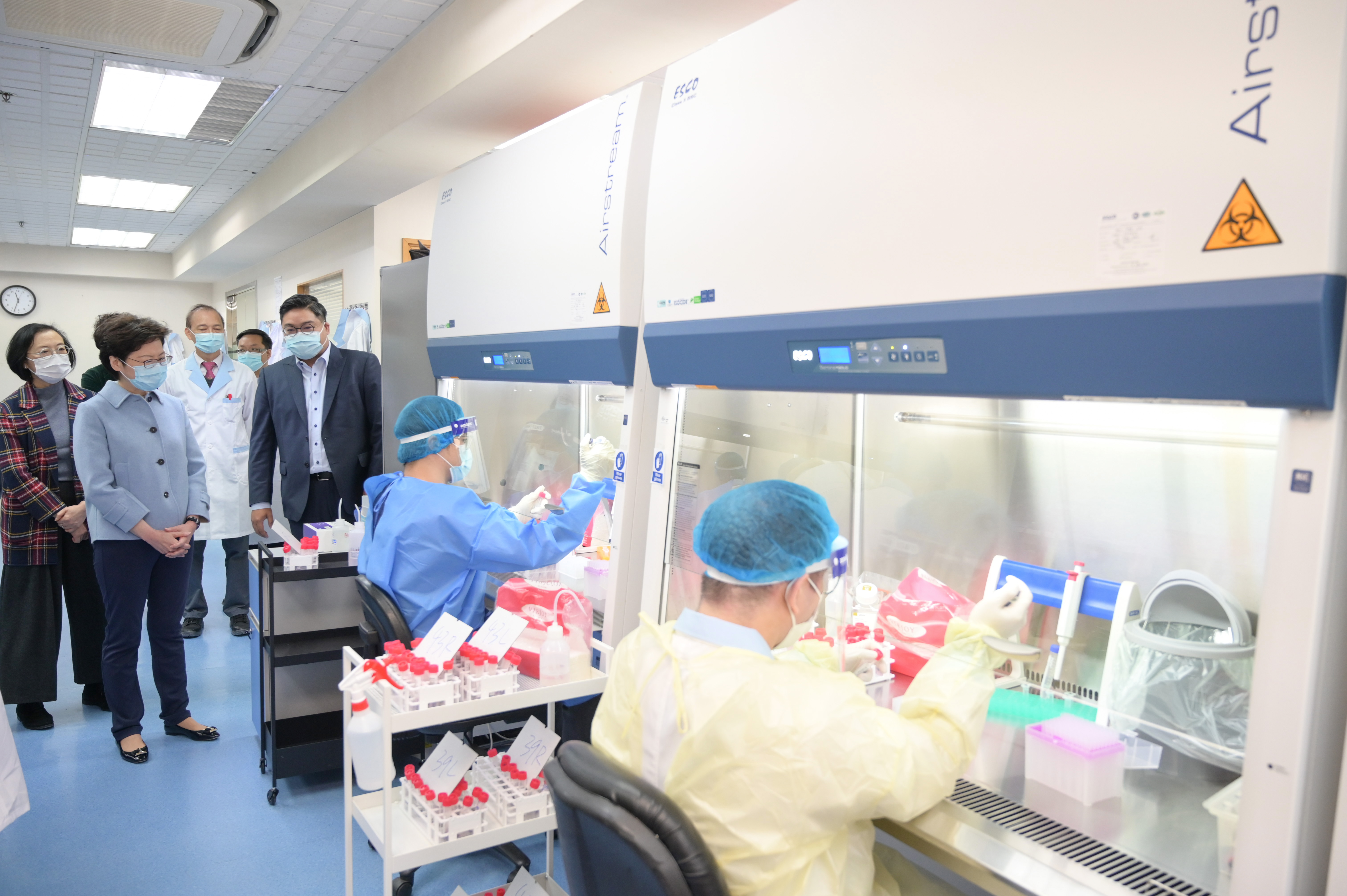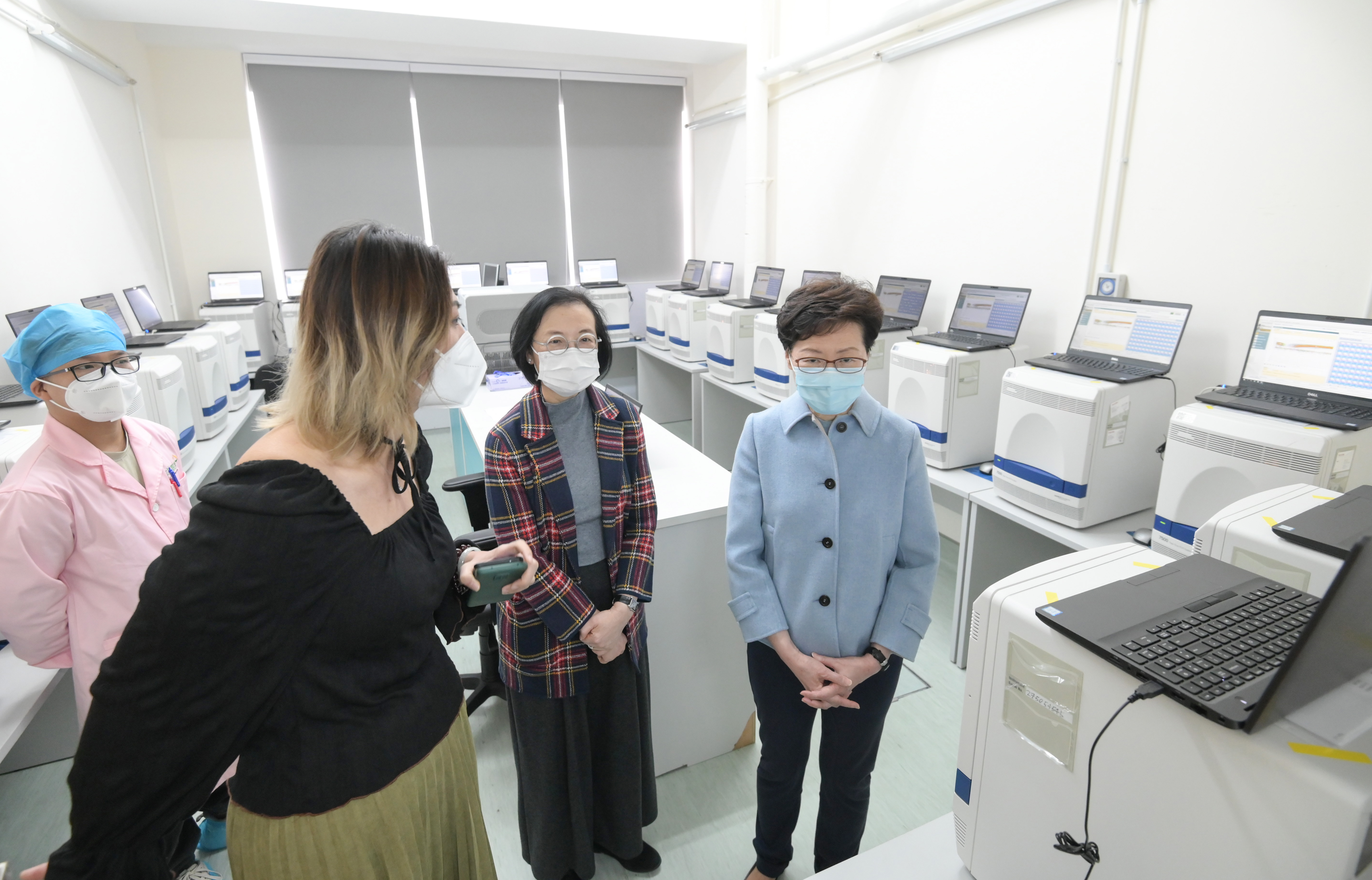 The Chief Executive, Mrs Carrie Lam (first right), today (December 25) visited the five private laboratories which help the Government provide COVID-19 testing services to learn more about their back of house operations and extend her holiday greetings to the staff members on duty. Photo shows Mrs Lam visiting the laboratory of KingMed Diagnostics (Hong Kong) Limited. Looking on is the Secretary for Food and Health, Professor Sophia Chan (second right).