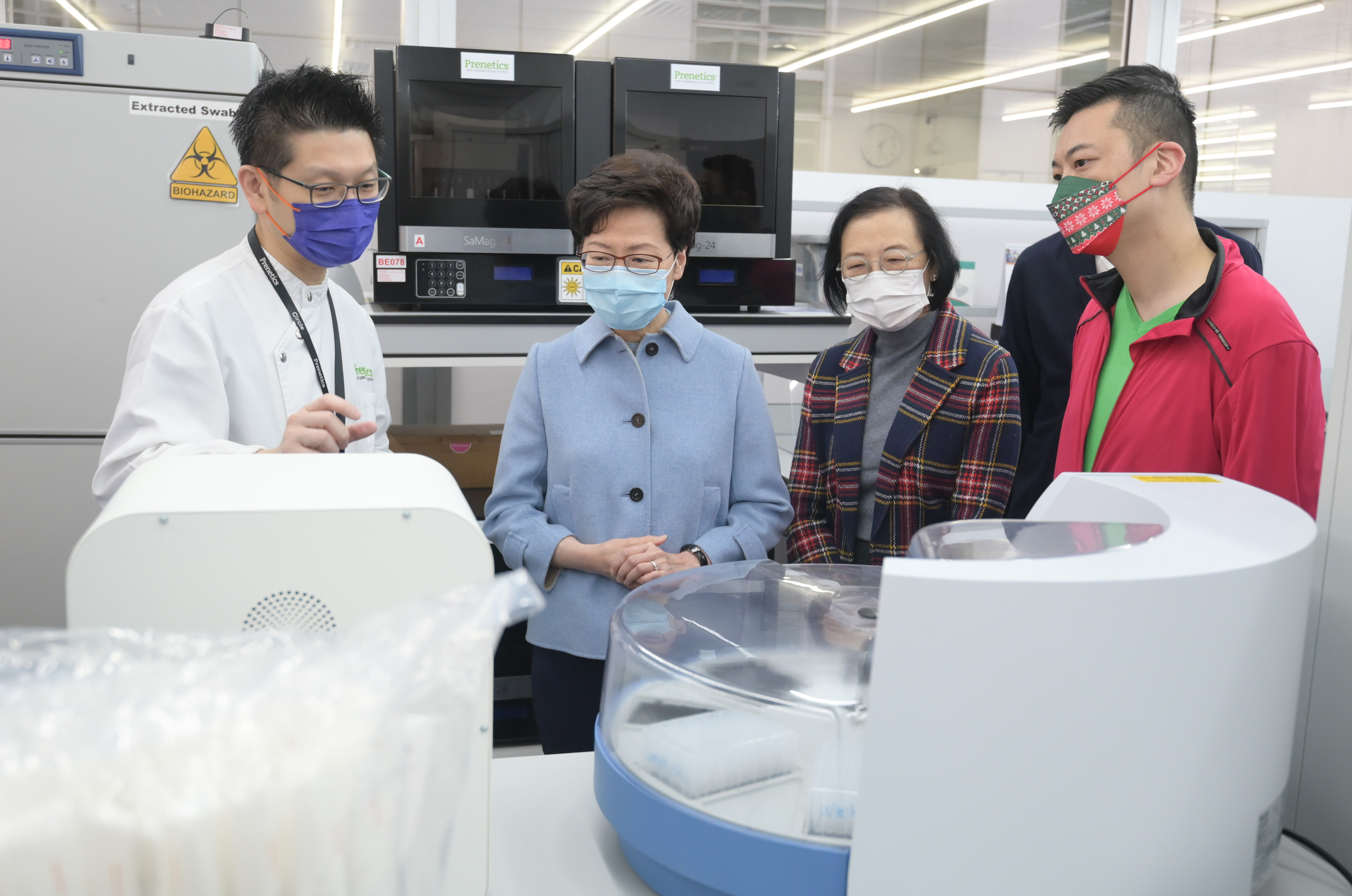 The Chief Executive, Mrs Carrie Lam (second left), today (December 25) visited the five private laboratories which help the Government provide COVID-19 testing services to learn more about their back of house operations and extend her holiday greetings to the staff members on duty. Photo shows Mrs Lam visiting the laboratory of Prenetics. Looking on is the Secretary for Food and Health, Professor Sophia Chan (third left).