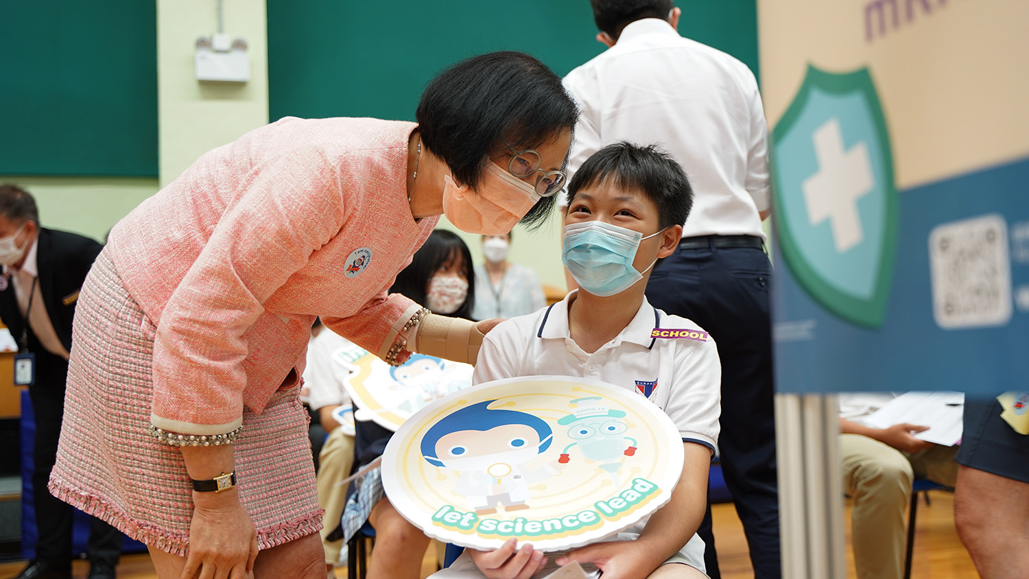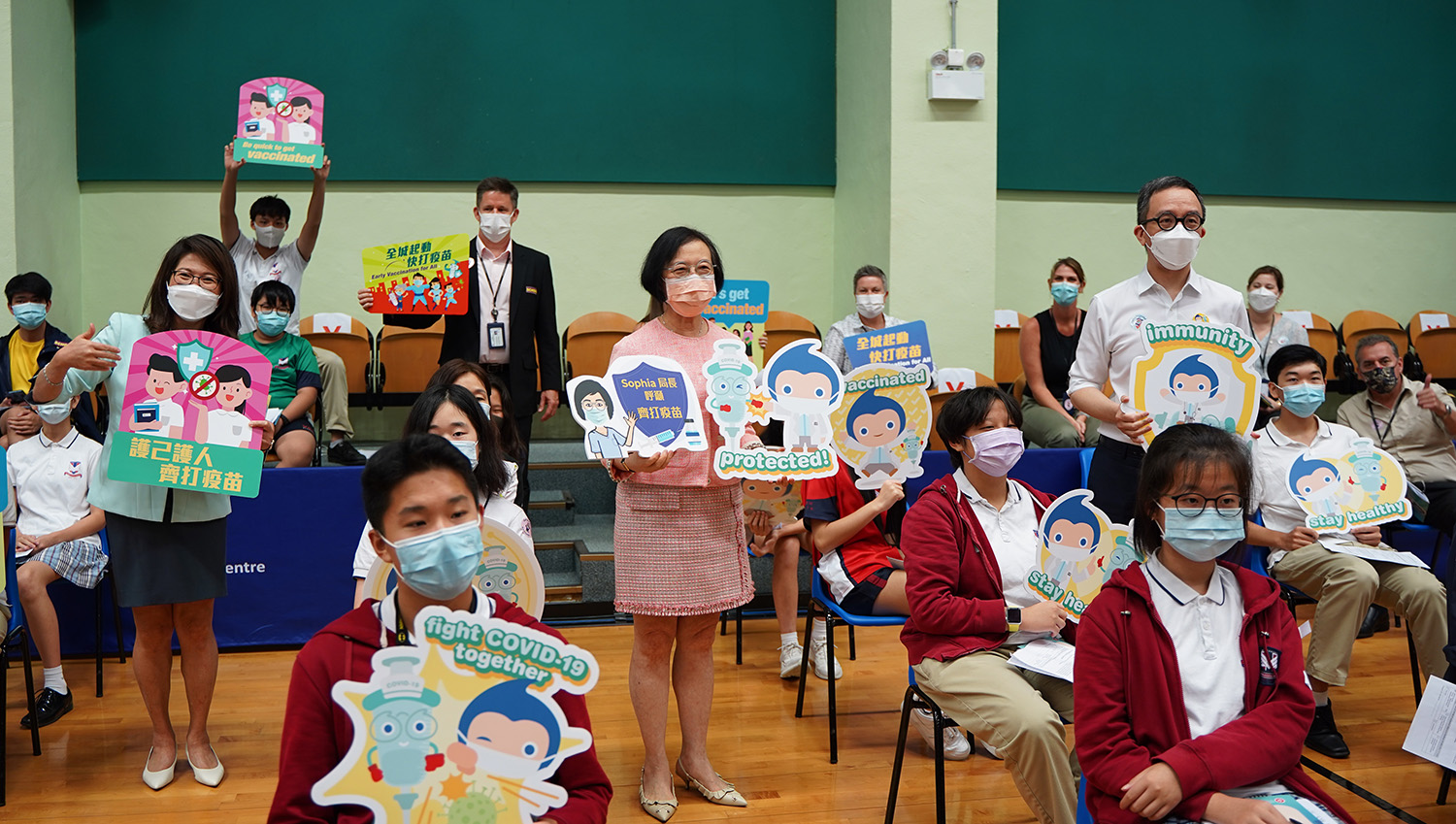 The Secretary for Food and Health, Professor Sophia Chan, today (June 24) visited the University of Hong Kong Community Vaccination Centre at Ap Lei Chau Sports Centre to view the administration of a COVID-19 vaccine for teachers, students and their parents of Victoria Shanghai Academy. Photo shows Professor Chan (right) chatting with students who have just been vaccinated.