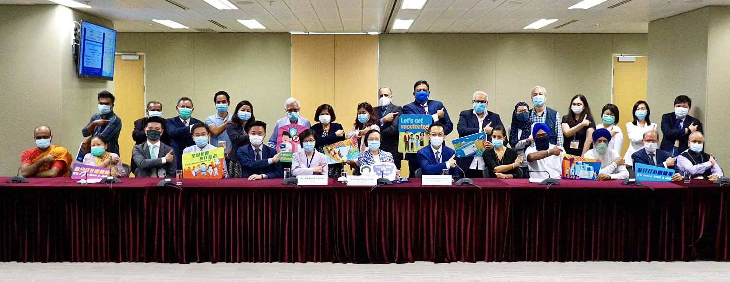 The Secretary for Food and Health, Professor Sophia Chan (front row, centre), accompanied by the Director of Health, Dr Constance Chan (front row, sixth left) and the Controller of the Centre for Health Protection, Dr Ronald Lam (front row, sixth right), met with representatives from local ethnic minorities groups today (July 8) to listen to their views and discuss on how to promote COVID-19 vaccination.