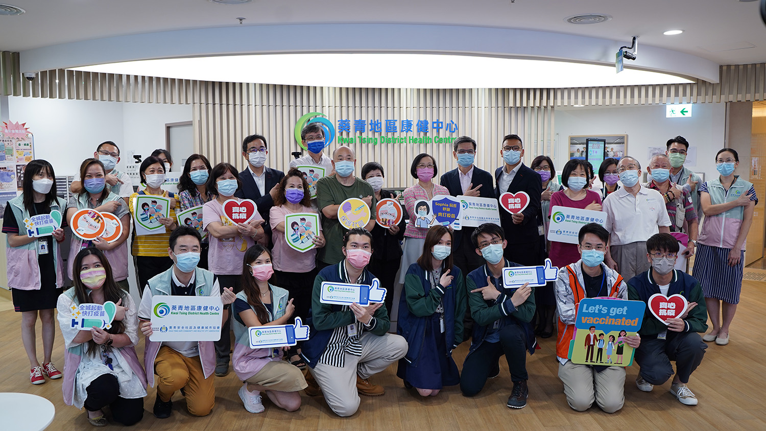 The Secretary for Food and Health, Professor Sophia Chan, visited the Kwai Tsing District Health Centre today (July 29) to learn about the outreach vaccination service co-organised by the Centre and network doctors in the community. Photo shows Professor Chan (second row, fifth right) at the Centre with others including elderly people participating in the outreach vaccination service and staff of the Centre.