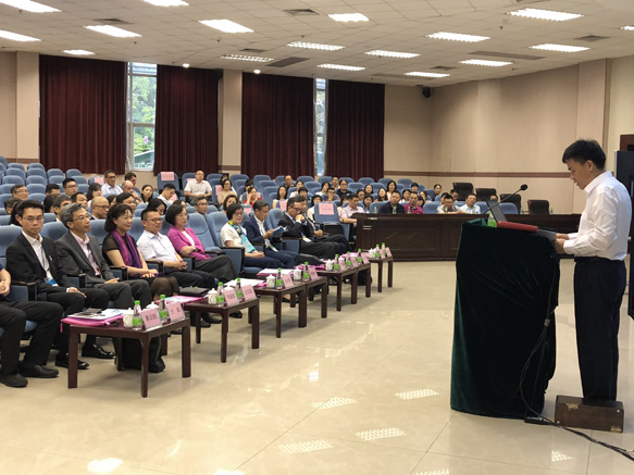 The 100-member delegation led by the Secretary for Food and Health, Professor Sophia Chan, this afternoon (August 7) arrived in Zhongshan to enhance exchanges and co-operation in the medical and healthcare field in the Guangdong-Hong Kong-Macao Bay Area. Photo shows Professor Chan (front row, fifth left); the Director of Health, Dr Constance Chan (front row, sixth left); and other delegation members being briefed by the Director of the Zhongshan Municipal Health and Family Planning Bureau, Mr Lei Jimin (right), on the latest medical and healthcare developments in Zhongshan.
