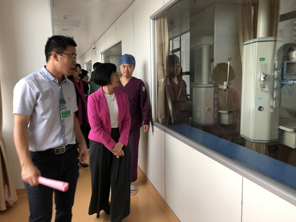 The 100-member delegation led by the Secretary for Food and Health, Professor Sophia Chan, this afternoon (August 7) arrived in Zhongshan to enhance exchanges and co-operation in the medical and healthcare field in the Guangdong-Hong Kong-Macao Bay Area. Photo shows Professor Chan (centre) and delegation members visiting the Zhongshan Torch Development Zone Hospital.